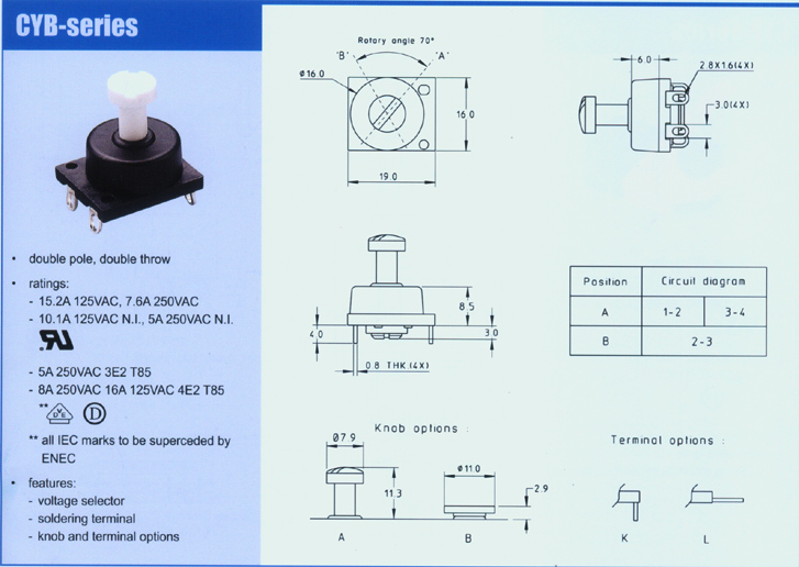 The instructions of productsRating - 10.1A 125VAC, 5A 250VAC UL cUL - 5A 250VAC 3E2 T85 - 8A 250VAC 16A 125VAC 4E2 T85 VDE DEMKO Configuration - double pole, double throw - voltage selector - soldering terminal - knob and terminal options