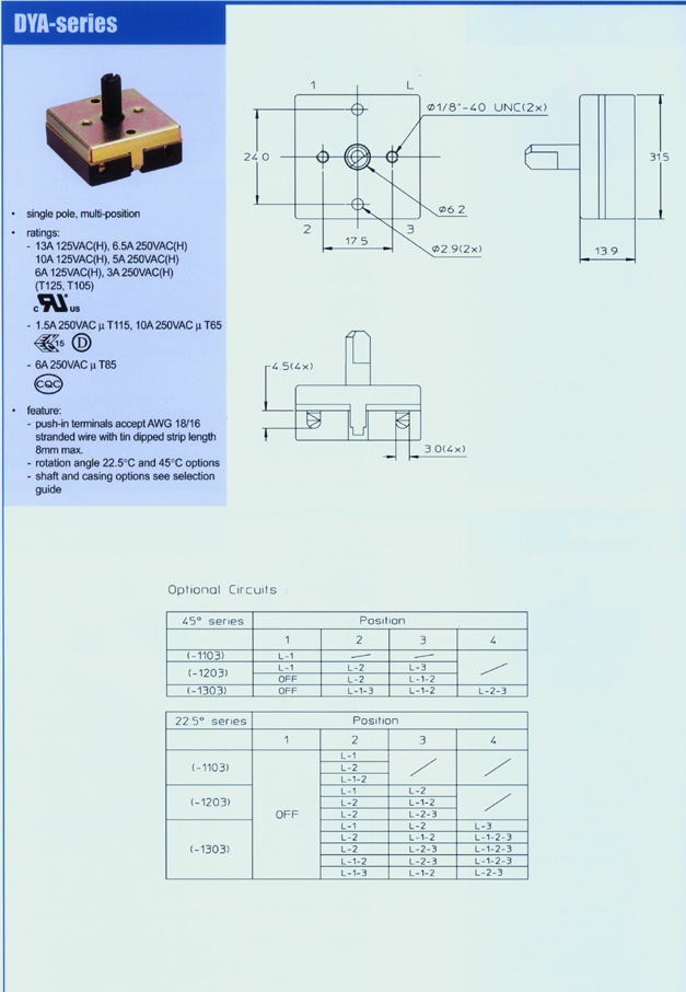 - 6A 250VAC u T85 CQC Configuration - single pole, multi-position - push-in terminals accept AWG18/16 stranded wire with tin dipped strip length 8mm max. |