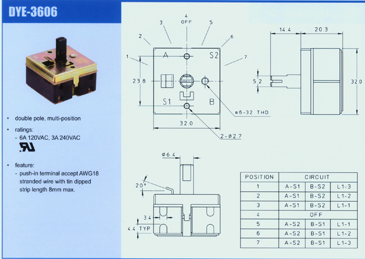 The instructions of products:Rating - 6A 120VAC, 3A 240VAC UL Configuration - double pole, multi-position - push-in terminal accept AWG18 stranded wire with tin dipped strip length 8mm max