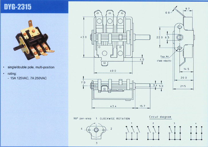 The instructions of products:Rating - 15A 125VAC, 7A 250VAC Configuration - single/double pole, multi-position